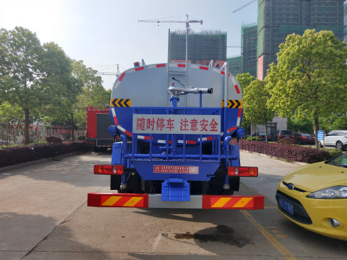 上裝配置:罐體容積為8-10立方灑水車,罐體鋼板為4mm碳鋼Q235材質,罐內隔板具有防波作用,以減輕汽車行駛時罐體液體沖擊,罐體及整車外形尺寸按照公告。帶大功率專用灑水泵,泵可自吸自排,整車前沖、后灑、側噴、帶65消防接口,后平臺帶綠化灑水炮,灑水炮可全方位旋轉,可連續調成直沖狀、大雨、小雨、毛毛雨;前封頭帶水位計,后平臺主管路帶1寸澆花接口,后爬梯。平臺后部帶小安全告知牌:“隨時停車,注意安全”,帶兩根水管及陰陽端。罐體顏色:上白/下藍,銀灰/銀藍,罐體兩側噴“灑水車、綠化噴灑車”字樣,貼反光標示。灑水車可加裝前沖后灑氣動閥駕駛室控制、可加裝霧炮機組發電機組噴霧降塵裝置、車頭可加裝推雪雪鏟、雪滾裝置街道、公路除雪等。