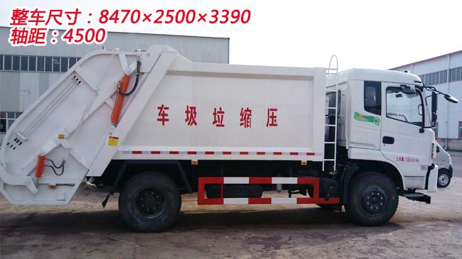 東風特商壓縮式垃圾車,采用東風D193-3駕駛室,配備東風康明斯發動機,8JS85變速箱,軸距4.5米。3.6噸前橋,10噸后橋,10.00R20鋼絲胎,帶ABS。可加裝行車記錄儀,電動玻璃,兩點懸浮,液壓反轉。