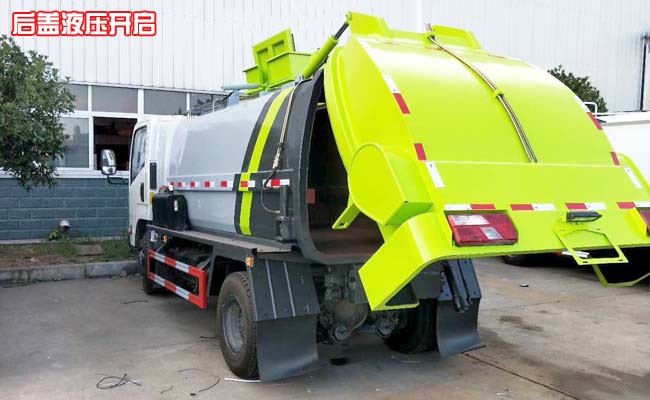 餐廚垃圾車裝載由垃圾桶提升系統完成,該系統具有垃圾桶鎖止結構,裝卸安全可靠。垃圾桶與垃圾投入口銜接好,保證裝卸過程中餐廚垃圾不溢撒、不遺漏。