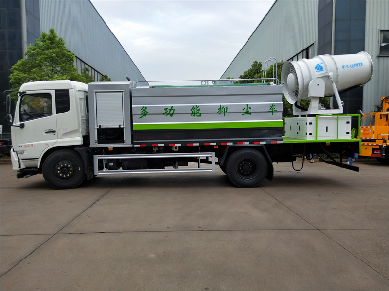 抑塵車吸程≧7米,灑水寬度≧14-16米,射程≧25-30米,引水時間<5min,流量60m3/h。前沖(噴)、后灑、帶側噴(花灑)、帶后工作平臺、平臺上安裝綠化灑水高炮(炮噴射形狀可調節:直沖、大雨、中雨、毛毛雨、霧狀、可連續調節,360°旋轉),配消防接口,自流閥,濾網,帶自吸自排功能。配備大功率專用灑水泵,泵可自吸自排,安裝過濾網,帶消防接口,可通過消防栓進水,帶自流閥,此車尾部帶大功率噴霧炮,霧炮射程可選裝50-100米,帶獨立柴油發電機組。