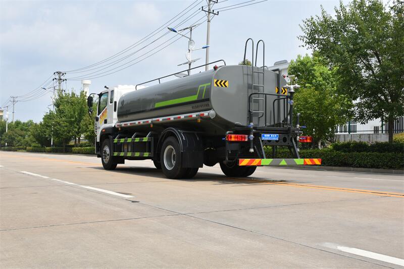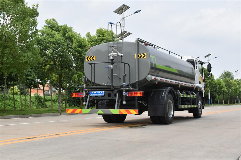福田15噸灑水車標配前噴(鴨嘴)、后沖、后灑、側噴、后置式工作 平臺,平臺上配置綠化水炮(可 360°旋轉,既可以調成柱狀,也可 以調成霧狀,更可以調成直沖狀、大雨、中雨、小雨、毛毛雨),配 備優質大功率專用灑水泵(可自吸自排,可從河里或池塘抽水到罐體), 取力器,雜物過濾網,消防接口,自流球閥系統、取力器、球閥、濾網 均為國家標準產品,主管道加粗,法蘭墊、法蘭盤加厚,大通徑球閥。 整體具備性能優良安全可靠、效率高、流量大、維修方便等特點。 二.產品配置 1.底盤配置: 發動機玉柴 200 馬力(四缸),法士特 8 檔變速箱,軸距 4500,前 橋 4.5T,后橋 10T,10.00 鋼絲胎,斷氣剎,空調,電動玻璃,ABS。