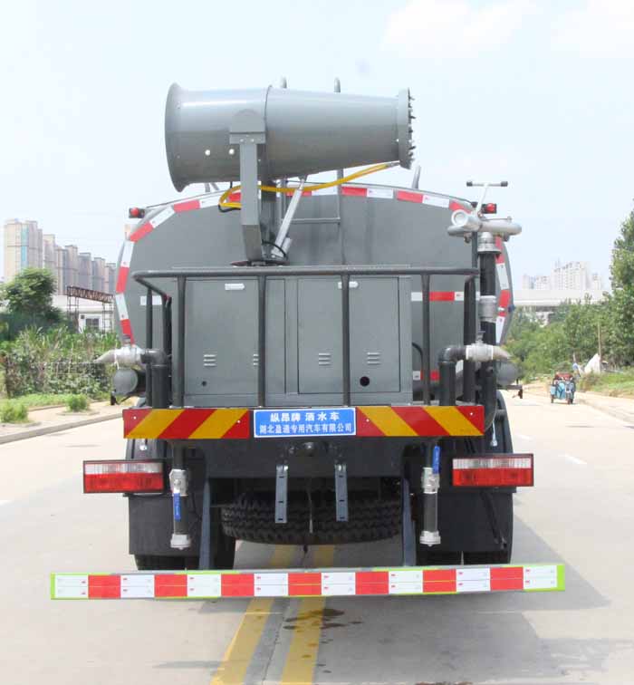 東風15噸灑水車產品標配前噴(鴨嘴)、后沖、后灑、側噴、后置式工作 平臺,平臺上配置綠化水炮(可 360°旋轉,既可以調成柱狀,也可 以調成霧狀,更可以調成直沖狀、大雨、中雨、小雨、毛毛雨),配 備優質大功率專用灑水泵(可自吸自排,可從河里或池塘抽水到罐體), 取力器,雜物過濾網,消防接口,自流球閥系統、取力器、球閥、濾網 均為國家標準產品