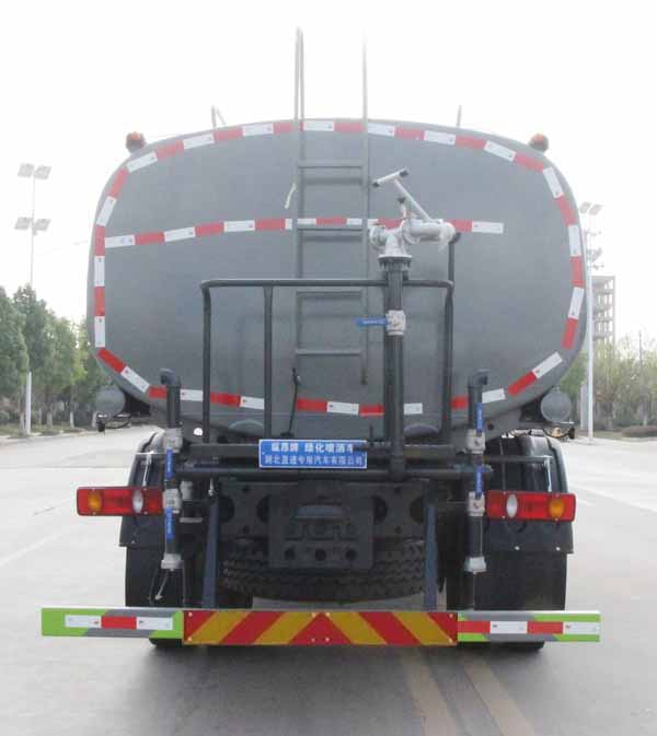 該車主要用于城鄉園林綠化噴灑;主要裝置為罐體及噴灑裝置.罐體總容量:12.16立方米;罐體有效容積:11.58立方米;罐體外形尺寸(長×長軸×短軸)(mm):4500×2450×1610.ABS型號及生產廠家為:3631010-C2000/東科克諾爾商用車制動系統(十堰)有限公司,J ABS/焦作博瑞克控制技術有限公司.側、后防護材料均為:Q235碳鋼,連接方式均為:螺栓連接,后部防護截面尺寸(mm):120×50,后部防護離地高度(mm):470.僅采用底盤3950mm軸距改裝.選裝前部不帶電子霧炮,選裝前部電子霧炮樣式.當前部不帶電子霧炮時,車長7750mm,無前伸;當前部選裝電子霧炮時,車長8250mm,前伸500mm.隨底盤選裝駕駛室.選裝自動球閥安裝位置,選裝后部箭頭燈裝置,選裝噴灑裝置樣式,選裝弧形噴灑裝置,選裝后部樣式.后部作業燈僅在作業時開啟,車輛行駛過程中不可開啟.選裝罐體頂部方形罐口,選裝工具箱裝置,選裝罐體頂部高位花灑裝置,選裝前部鴨嘴裝置.隨底盤選裝尿素罐/電瓶框/儲氣筒布置位置.