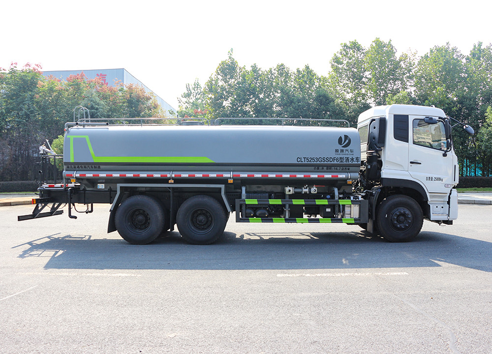 東風天龍20噸灑水車整車型號 CLT5253GSSDF6 型灑水車 2 發動機型號 D6.7NS6B290 3 發動機馬力/功率 康明斯 290 馬力/213KW 4 發動機排量 6700ML 5 變速箱 大同 7 檔變速箱 6 輪胎規格 295 真空胎 7 軸距 4350+1350 8 總質量 25000KG 9 整備質量 10800KG 10 額定載質量 14070KG 11 整車尺寸(長×寬×高) 10*2.5*3.2 12 罐體容積 18.3 方 13 燃料種類 柴油 14 排放標準 國六 15 水泵型號 60/90 16 罐體材質 Q235 碳鋼.產品功能 前沖鴨嘴 后灑 后對沖 高炮 高位花灑 側噴