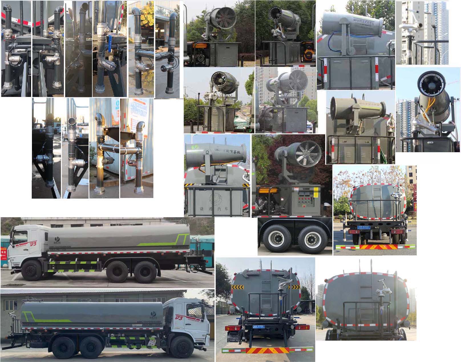 我公司產品標配前噴(鴨嘴)、后沖、后灑、側噴、后置式工作 平臺,平臺上配置綠化水炮(可 360°旋轉,既可以調成柱狀,也可 以調成霧狀,更可以調成直沖狀、大雨、中雨、小雨、毛毛雨),配 備優質大功率專用灑水泵(可自吸自排,可從河里或池塘抽水到罐體), 取力器,雜物過濾網,消防接口,自流球閥系統、取力器、球閥、濾網 均為國家標準產品,主管道加粗,法蘭墊、法蘭盤加厚,大通徑球閥。 整體具備性能優良安全可靠、效率高、流量大、維修方便等特點。