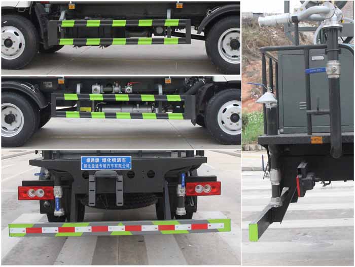 該車主要用于城鄉園林綠化噴灑作業;主要裝置為罐體及噴灑裝置.罐體總容量:7.4立方米,罐體有效容積:7立方米;罐體外形尺寸(長×長軸×短軸)(mm):4000×2000×1320,4200×2000×1310.介質:丙酮水溶液;介質密度(千克/立方米):950.側、后防護材料均為:Q235碳鋼,連接方式均為:螺栓連接,后部防護截面尺寸(mm):120×50,后部防護離地高度(mm):450.ABS系統型號:ABS-VI.E;生產企業:廣州瑞立科密汽車電子股份有限公司.ABS系統型號:ABS-E;生產企業:威伯科汽車控制系統(中國)有限公司.選裝前部電子霧炮樣式.選裝前部不帶電子霧炮.當前部不帶電子霧炮時,車輛長度7200mm,7460mm,無前伸;當前部選裝電子霧炮時,車輛長度7700mm,7960mm,前伸500mm.選裝噴灑裝置樣式,選裝安裝氣動球閥,選裝不安裝氣動球閥,選裝前部噴灑裝置樣式,選裝罐體頂部高位花灑裝置.選裝箭頭燈裝置,后部作業燈僅在作業時開啟,車輛行駛過程中不可開啟.