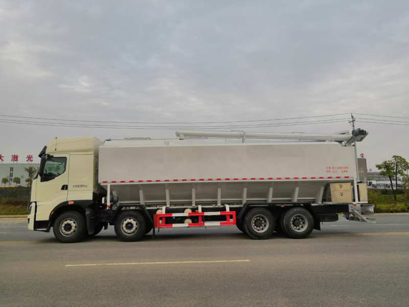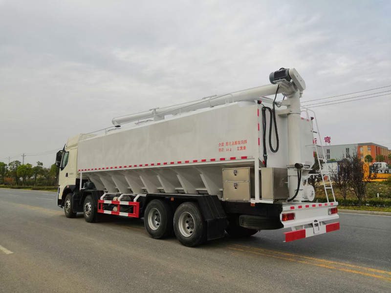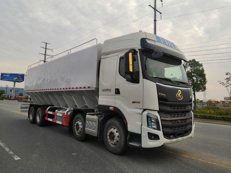 柳汽乘龍前四后八散裝飼料運輸車/40方養殖場飼料配送車整車型號:XBZ5310ZSLL6,柳汽H7駕駛室,玉柴460馬力國六發動機,法士特12檔鋁合金變速箱,5.5T雙前橋,440雙后橋,12R22.5,全氣囊懸浮駕駛室,電動玻璃、LCD液晶儀表、自動空調、真皮多功能方向盤、定速巡航、ABS、中控鎖、自動調整臂。整車尺寸:12000×2500×3995mm。/40方散裝飼料車