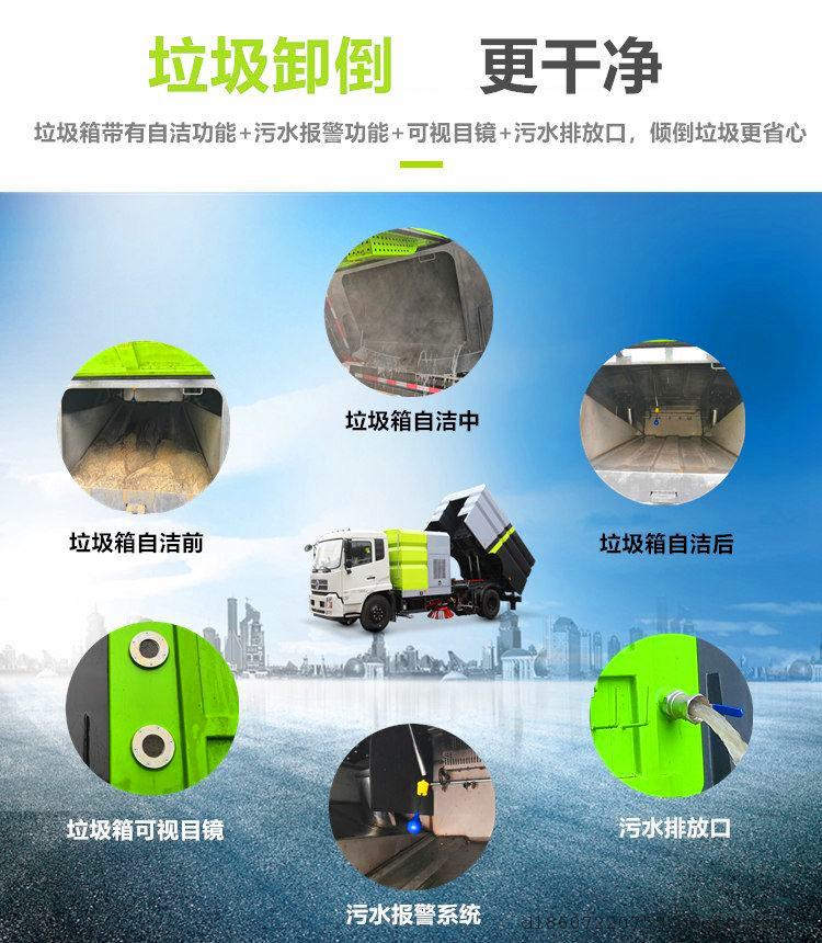洗掃車上裝配置:加裝副發動機、風機、清水箱、垃圾箱、左右立掃、后置吸盤,掃盤降塵系統,液壓系統、專用裝置電控系統和副車架等改裝而成(可加裝前沖后灑,可以根據客戶要求做成方形、圓形箱體。)