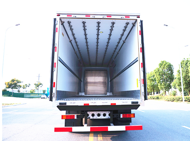 東風天龍9米6冷藏車廂體配置為:斷橋隔溫工藝,整體結構框架,內外面料為3mm新款啞光玻璃鋼夾保溫層真空復合而成,廂體厚度為8cm,最新款鋁合金包邊型材,型材局部厚度為4mm(鋼制鉚釘加固),廂體內部采用2個LED照明燈及廂體示寬燈,后門框不銹鋼材質,門框密封條為三元乙丙橡膠材質,加厚型不銹鋼合頁及鎖件;副梁為Q700車用大梁鋼,15mm厚大梁墊皮,加裝防撞膠塊,不銹鋼門鎖件,配后雙開門,副駕駛一側居中靠前開單側門一個,帶2個排水孔。