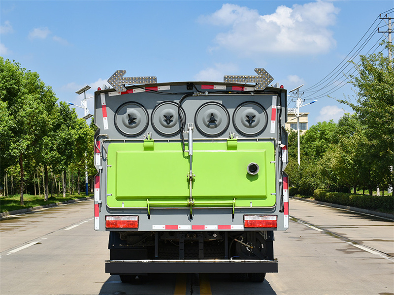 8. 尾部加有噴桿,通過電磁隔膜泵驅動噴水路面抑塵。箱體上裝:優質碳銹鋼垃圾箱,3mm 邊板,4mm 底板,用于儲存垃圾,底板整體 折邊無縫焊接,杜絕了泄漏風險。簡潔美觀、抗變形性能強、結構可靠性好,同時有 效增加實際裝填容積,超過同類產品,不易變形、耐磨損、耐腐蝕性強。 自卸:液壓缸舉升,垃圾箱自卸。 副發動機:副發動機為風機運轉提供動力。風機:副發動機和風機是清掃車的兩大核心部件、副發動機為風機運轉提供動力、使 得路面垃圾被吸入箱體內部存放,從而實現路面清潔作業。風機采用大功率耐磨離心 式免維護風機,無噪音,效率高風量大,使用壽命長。 自動離合器:減少風機啟動和停止時對發動機的沖擊。離合器在使用過程中具有高度 耐磨、使用壽命長、低噪音、低油耗量和節省成本的優點。 吸盤:吸盤內置滾掃,有效清掃路面垃圾。 濾芯:豎直濾筒,方便清理、拆卸。 電磁閥:海普瑞斯電磁閥組是車輛液壓系統的核心部件,控制整車液壓驅動,雙向操 作按鈕,包括掃盤升降、吸盤升降、垃圾箱舉升、后門開閉等一系列機械操作,隨車 配備的有電磁閥控制盒罩,有效避免灰塵及垃圾物進入盒內。 側邊刷:增加作業寬度,并有效將垃圾掃入吸盤位置。 影像系統:車體后方裝有監視探頭,實時監控作業情況并顯示在駕駛室內顯示屏上, 最大限度的保證清吸效果。控制開關:集成疊加設計,PLC 駕駛室電液集中控制,方便操作。 電子隔膜泵:控制尾部噴水桿,噴水抑塵。 應急系統:可通過手動應急液壓泵來控制全車液壓系統。 尾部噴水:作業完成后,尾部抑塵。
