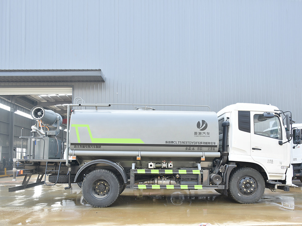 東風天錦 12 方抑塵車-灑水車產品配置 1.底盤配置: 發動機康明斯 210 馬力(6 缸),東風 6 檔變速箱,D530 排半 標準頂,4.5T 前橋,9T 后橋,10.00 鋼絲胎,軸距 4700,250 雙層大 梁,斷氣剎,空調,電動玻璃2.上裝配置: 1、罐體約為 12 方,可加裝 30-40 型霧炮 2、邊燈帶電,罐體尾部上方標配 2 個紅色示寬燈, 3、標配前噴為鴨嘴直沖,標配后沖,用戶可根據自己的需求,來調 整對沖位置。 4、花紋防滑平臺,炮筒后蓋為定制型螺栓卡扣, 5、前噴、后沖、后灑、側噴,綠化高炮開關球閥均采用 50 大通經 不銹鋼球閥, 6、新式軸承式水炮,更加耐用, 7、60-90 型水泵, 8、防腐法蘭墊片, 9、鋁制后灑,不易炸開 10、罐體自動焊(美國林肯焊機及電源),拼板自動焊接,封頭環 縫焊接,無氣孔,焊縫美觀。 11、側護網、后保險杠、均為螺栓連接,方便拆卸,維修方便。 12、塑料擋泥板,替代鐵擋泥板,更加輕便,用螺栓連接,方便拆 卸。 13、前部、后部主管連接處為 6 孔圓法蘭,不易沖墊