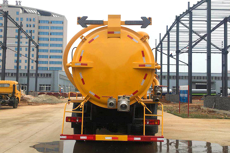 2、罐體液壓升舉,后蓋液壓打開。便于將各種淤泥污水傾倒干凈,方便清理罐體。