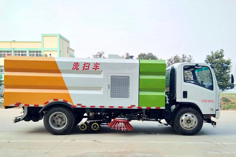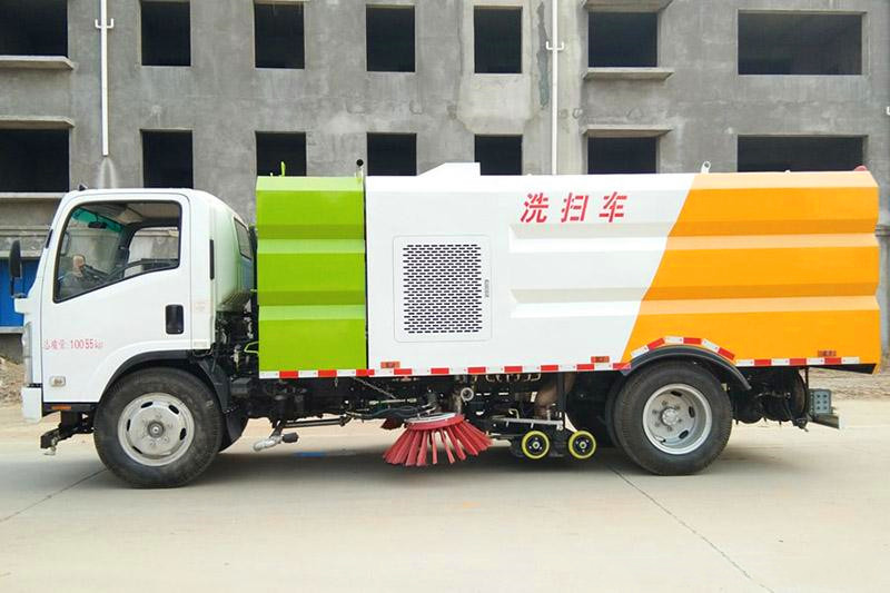 陜汽5噸洗掃車配置:清水箱容積: 5m3、垃圾箱容積: 4m3、清掃寬度:3.2m、發動機馬力:濰柴130馬力,帶2個中置掃盤,康明斯170馬力副發動機;大力馬達;臺灣液壓閥組;威龍低壓泵(前沖);4mm不銹鋼垃圾箱;4mm不銹鋼水箱;不銹鋼高壓管路;雙層不銹鋼吸塵筒;德國控制器;美國傳感器;尾部箭頭燈;機油、垃圾箱、水箱均帶防溢或低位報警裝置;倒車及洗掃狀態室內監視器;倒車防撞自動保護裝置;檢修安全保護裝置;掃刷臂轉動機構使用高新耐磨工程隔套,免打黃油;20m高壓沖洗卷盤。集成式運動控制器,一鍵電腦控制