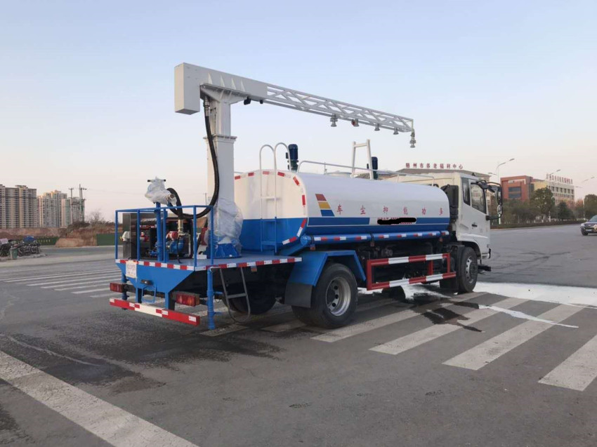 抑塵車上裝配置:罐體為4.5方方形罐,前沖、后灑、側(cè)噴、高炮,抑塵噴灑桿(帶旋轉(zhuǎn)伸縮功能)。噴灑桿離地3.5-4.5米 ,后部平臺(tái)帶8KW副發(fā)電機(jī)組,罐體內(nèi)部加兩個(gè)1.5KW電動(dòng)馬達(dá)(帶攪拌功能)罐體噴漆上白下藍(lán),平臺(tái)和噴灑桿藍(lán)色。遙控操作噴灑桿上下左右旋轉(zhuǎn),電控箱安裝在后部平臺(tái)。