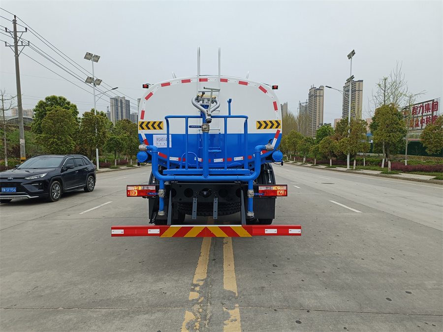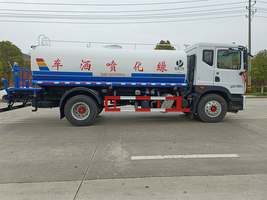 產品標配前噴(鴨嘴)、后沖、后灑、側噴、后置式工作 平臺,平臺上配置綠化水炮(可 360°旋轉,既可以調成柱狀,也可 以調成霧狀,更可以調成直沖狀、大雨、中雨、小雨、毛毛雨),配 備優質大功率專用灑水泵(可自吸自排,可從河里或池塘抽水到罐體), 取力器,雜物過濾網,消防接口,自流球閥系統、取力器、球閥、濾網 均為國家標準產品,主管道加粗,法蘭墊、法蘭盤加厚,大通徑球閥。 整體具備性能優良安全可靠,可以加裝電子水炮,氣動球閥,霧炮